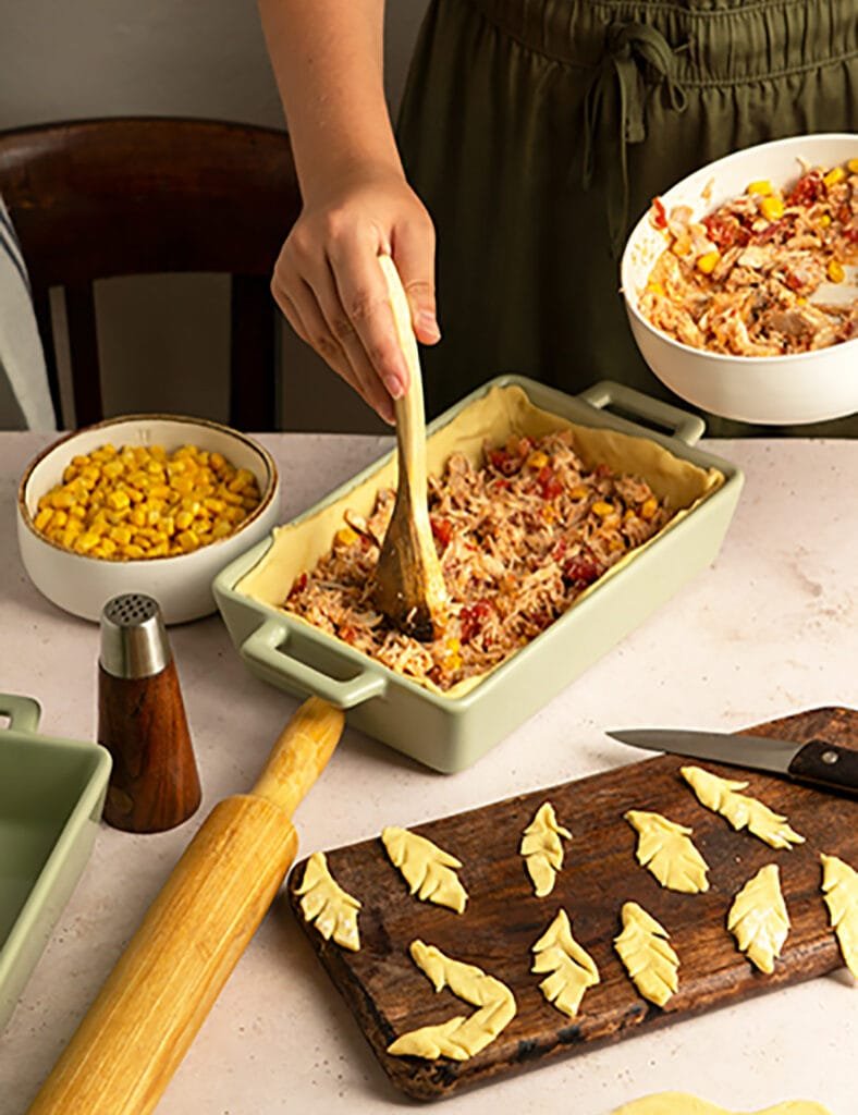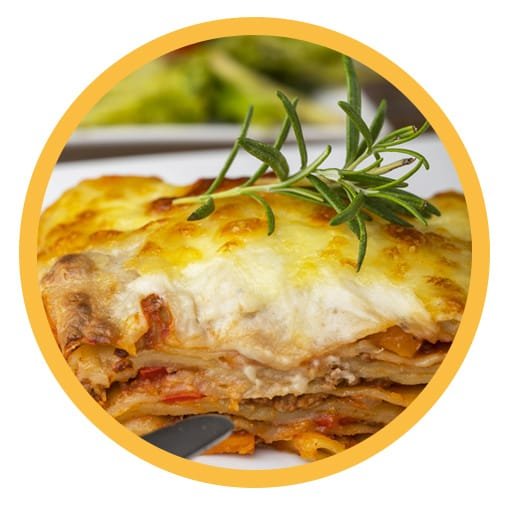 Láminas de pasta casera rellenas de pollo, verduras y queso gratinado. Acompáñalas con ensalada campestre o papas a la francesa.